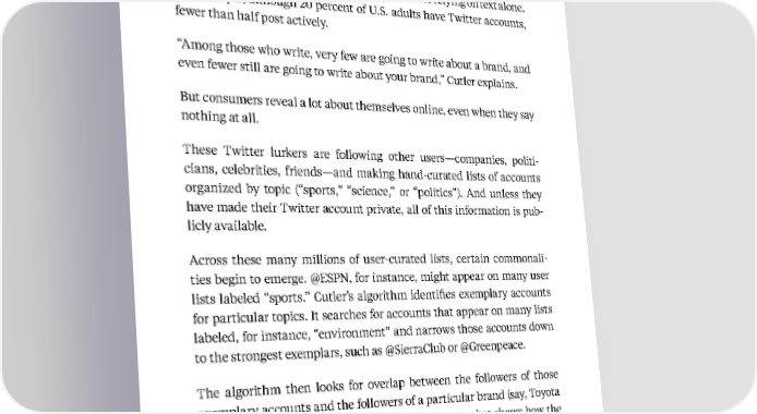 93 Kellogg Insight consumers are saying about their brands. Though Cutler believes text analysis has its place, there are serious drawbacks to relying on text alone. For example, although 20 percent of U.S. adults have Twitter accounts, fewer than half post actively. “Among those who write, very few are going to write about a brand, and even fewer still are going to write about your brand,” Cutler explains. But consumers reveal a lot about themselves online, even when they say nothing at all. These Twitter lurkers are following other users—companies, politi - cians, celebrities, friends—and making hand-curated lists of accounts organized by topic (“sports,” “science,” or “politics”). And unless they have made their Twitter account private, all of this information is pub - licly available. Across these many millions of user-curated lists, certain commonali - ties begin to emerge. @ESPN, for instance, might appear on many user lists labeled “sports.” Cutler’s algorithm identifies exemplary accounts for particular topics. It searches for accounts that appear on many lists labeled, for instance, “environment” and narrows those accounts down to the strongest exemplars, such as @SierraClub or @Greenpeace. The algorithm then looks for overlap between the followers of those exemplary accounts and the followers of a particular brand (say, Toyota Prius). This information is used to compute a score that shows how the brand is associated with the attribute. Lower scores mean most custom - ers do not associate the brand strongly with the attribute (say, Walmart and luxury); higher scores indicate a stronger association (Toyota Prius Based on research from Jennifer Cutler