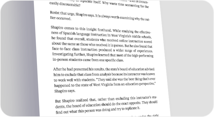 78 Kellogg Insight all, the data might have been entered incorrectly or appear as the result of a modeling error. Or it may represent a freak accident—a set of circum - stances unlikely to replicate itself. Why waste time accounting for the easily discountable? Resist that urge, Shapiro says. It is always worth examining why the out - lier occurred. Shapiro comes to this insight firsthand. While studying the effective - ness of Spanish language instruction in West Virginia’s middle schools, he found that overall, students who received online instruction scored about the same as those who received it in person. But he also found that face-to-face class instruction produced a wider range of experiences. Investigating further, Shapiro learned that most of the high-performing in-person students came from one specific class. After he had presented his results, the state’s board of education advised him to exclude that class from analysis because its instructor was known to work well with students. “They said she was the best thing that’s ever happened to the state of West Virginia from an education perspective,” Shapiro says. But Shapiro realized that, rather than excluding this instructor’s stu - dents, the board of education should do the exact opposite. They should find out what this person was doing and try to replicate it. What this outlier ultimately demonstrated was that, under the right circumstances, the in-person classroom model had the potential to outperform online instruction. This is an important first step toward understanding the potential of these outliers, Shapiro says. “They Based on insights from Joel K. Shapiro