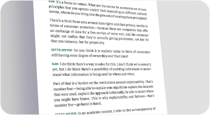 121 Kellogg Insight ZETTELMEYER: Okay, accountability. What’s your second focus area to build trust in AI? SUH: It’s a focus on values. What are the norms for a common set of core principles that you operate under? And depending on different cultural norms, whom do you bring into the process [of creating these principles]? There’s a third focus area around data rights and data privacy, mostly in terms of consumer protection—because there are companies that offer an exchange of data for a free service of some sort, and the consumer might not realize that they’re actually giving permission, not just for that one instance, but for perpetuity. ZETTELMEYER: Do you think it is realistic today to think of consumers still having some degree of ownership over their data? SUH: I do think there’s a way to solve for this. I don’t think we’ve solved it yet, but I do think there’s a possibility of enabling individuals to under - stand what information is being used by whom and when. Part of that is a burden on the institutions around explainability. That’s number four—being able to explain your algorithm: explain the data sets that were used, explain the approach holistically, be able to detect where you might have biases. This is why explainability and fairness—that’s number five—go hand in hand. ZETTELMEYER: In an academic context, I refer to this as transparency of execution. I actually thought you were going to say something slightly different, that we need to move to a place where some of the more flexible algorithms like neural networks or deep learning can be interpreted. Based on insights from Florian Zettelmeyer and Inhi Cho Suh