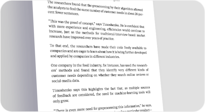 104 Kellogg Insight product innovation. Redundant reviews, also prevalent in the corpus, mention the same deficit or perk over and over again. The researchers found that the prescreening by their algorithm allowed the analysts to find the same number of customer needs in about 20 per - cent fewer sentences. “This was the proof of concept,” says Timoshenko. He is confident that with more experience and engineering, efficiencies would continue to increase, just as the methods for traditional-interview-based market research have improved over years of practice. To that end, the researchers have made their code freely available to companies and are eager to learn about how it is being further developed and applied by companies in different industries. One company in the food industry, for instance, has used the research - ers’ methods and found that they identify very different kinds of customer needs depending on whether they search online reviews or social-media data. Timoshenko says this highlights the fact that, as multiple sources of feedback are considered, the need for machine-learning tools will only grow. “There is even more need for preprocessing this information,” he says, “because there are millions of Amazon reviews for a particular product— but if you want to combine that with the social-media data and online reviews from other sources, it just blows up the amount of content you have to process. And that makes machine learning very important.” Based on research from Artem Timoshenko
