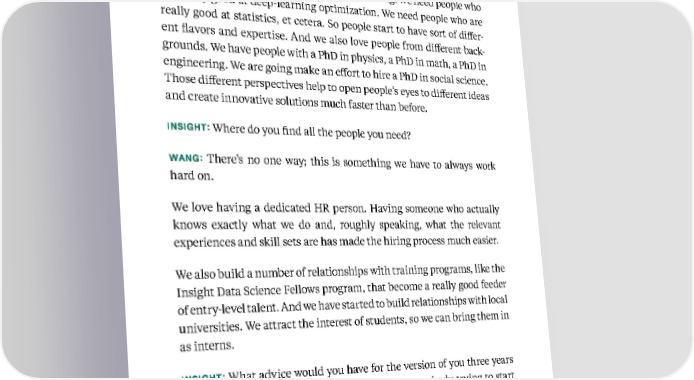 54 Kellogg Insight Even within data scientists, we need different skill sets. We need people who are really good at natural language processing. We need people who are really good at deep-learning optimization. We need people who are really good at statistics, et cetera. So people start to have sort of differ - ent flavors and expertise. And we also love people from different back - grounds. We have people with a PhD in physics, a PhD in math, a PhD in engineering. We are going make an effort to hire a PhD in social science. Those different perspectives help to open people’s eyes to different ideas and create innovative solutions much faster than before. INSIGHT: Where do you find all the people you need? WANG: There’s no one way; this is something we have to always work hard on. We love having a dedicated HR person. Having someone who actually knows exactly what we do and, roughly speaking, what the relevant experiences and skill sets are has made the hiring process much easier. We also build a number of relationships with training programs, like the Insight Data Science Fellows program, that become a really good feeder of entry-level talent. And we have started to build relationships with local universities. We attract the interest of students, so we can bring them in as interns. INSIGHT: What advice would you have for the version of you three years ago? What knowledge would you want to give somebody trying to start up an analytics capability in a large organization? WANG: It really helped me that from very early on I had a very strong sponsor. He is one of our senior staff, and he reports directly to the CEO. Based on insights from Jing Wang