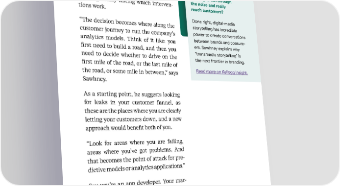 33 Kellogg Insight Looking to cut through the noise and really reach customers? Done right, digital-media storytelling has incredible power to create conversations between brands and consum- ers. Sawhney explains why “transmedia storytelling” is the next frontier in branding. Read more on Kellogg Insight. experience could be personalized, rethought, or otherwise improved, and then rigorously testing which interven - tions work. “The decision becomes where along the customer journey to run the company’s analytics models. Think of it like: you first need to build a road, and then you need to decide whether to drive on the first mile of the road, or the last mile of the road, or some mile in between,” says S awh ne y. As a starting point, he suggests looking for leaks in your customer funnel, as these are the places where you are clearly letting your customers down, and a new approach would benefit both of you. “Look for areas where you are failing, areas where you’ve got problems. And that becomes the point of attack for pre - dictive models or analytics applications.” Say you’re an app developer. Your mar - keting campaign generated 100,000 leads—and most of those have signed up for a free version of your product. But very few are shelling out for the paid Based on insights from Mohan Sawhney