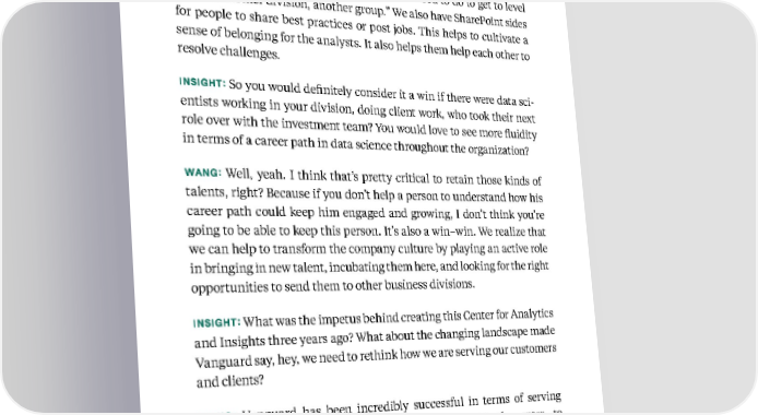 50 Kellogg Insight so someone can actually say, “Hey, I’m working in this division. I’m doing all these things at a level two. So here’s what I need to do to get to level three in another division, another group.” We also have SharePoint sides for people to share best practices or post jobs. This helps to cultivate a sense of belonging for the analysts. It also helps them help each other to resolve challenges. INSIGHT: So you would definitely consider it a win if there were data sci - entists working in your division, doing client work, who took their next role over with the investment team? You would love to see more fluidity in terms of a career path in data science throughout the organization? WANG: Well, yeah. I think that’s pretty critical to retain those kinds of talents, right? Because if you don’t help a person to understand how his career path could keep him engaged and growing, I don’t think you’re going to be able to keep this person. It’s also a win–win. We realize that we can help to transform the company culture by playing an active role in bringing in new talent, incubating them here, and looking for the right opportunities to send them to other business divisions. INSIGHT: What was the impetus behind creating this Center for Analytics and Insights three years ago? What about the changing landscape made Vanguard say, hey, we need to rethink how we are serving our customers and clients? WANG: Vanguard has been incredibly successful in terms of serving investors. Our whole purpose is to really put a client in the center—to take a stand for all investors, to treat them fairly and give them the best chance for success. Based on insights from Jing Wang