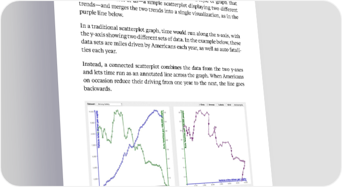 67 Kellogg Insight Take, for instance, the connected scatterplot—a technique whose effectiveness Franconeri has researched . It takes a style of graph that is familiar to most of us—a simple scatterplot displaying two different trends—and merges the two trends into a single visualization, as in the purple line below. In a traditional scatterplot graph, time would run along the x-axis, with the y-axis showing two different sets of data. In the example below, these data sets are miles driven by Americans each year, as well as auto fatali - ties each year. Instead, a connected scatterplot combines the data from the two y-axes and lets time run as an annotated line across the graph. When Americans on occasion reduce their driving from one year to the next, the line goes backwards. Based on insights from Steve Franconeri Credit: Steve Haroz. This scatterplot is derived from one originally constructed by Hannah Fairfield for The New York Times . To interact with the connected scatterplot yourself, visit Haroz’s site here .