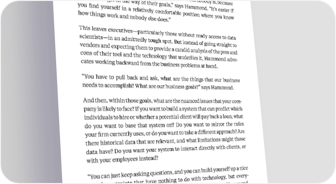 23 Kellogg Insight “Who is incented to explain things in a way that allows companies to make genuinely deep, informed decisions? It turns out nobody is, because it often will get in the way of their goals,” says Hammond. “It’s easier if you find yourself in a relatively comfortable position where you know how things work and nobody else does.” This leaves executives—particularly those without ready access to data scientists—in an admittedly tough spot. But instead of going straight to vendors and expecting them to provide a candid analysis of the pros and cons of their tool and the technology that underlies it, Hammond advo - cates working backward from the business problems at hand. “You have to pull back and ask, what are the things that our business needs to accomplish? What are our business goals?” says Hammond. And then, within those goals, what are the nuanced issues that your com - pany is likely to face? If you want to build a system that can predict which individuals to hire or whether a potential client will pay back a loan, what do you want to base that system on? Do you want to mirror the rules your firm currently uses, or do you want to take a different approach? Are there historical data that are relevant, and what limitations might those data have? Do you want your system to interact directly with clients, or with your employees instead? “You can just keep asking questions, and you can build yourself up a nice set of constraints that have nothing to do with technology, but every - thing to do with what you want the business to become,” says Hammond. “Now when you talk to a vendor, you have a set of questions you can ask. And when that vendor says, ‘Oh no, this is too complex. You’re never going to be able to understand it,’ you can say, ‘Yeah, you need to be able Based on insights from Kris Hammond