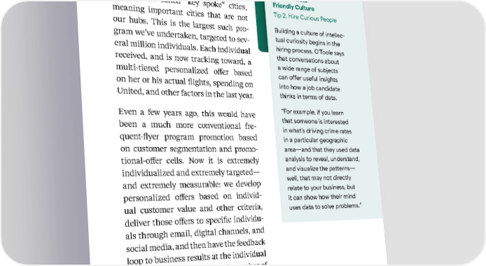 38 Kellogg Insight doing a targeted-marketing program, particularly to grow our market share in what are called “key spoke” cities, meaning important cities that are not our hubs. This is the largest such pro - gram we’ve undertaken, targeted to sev - eral million individuals. Each individual received, and is now tracking toward, a multi-tiered personalized offer based on her or his actual flights, spending on United, and other factors in the last year. Even a few years ago, this would have been a much more conventional fre - quent-flyer program promotion based on customer segmentation and promo - tional-offer cells. Now it is extremely individualized and extremely targeted— and extremely measurable: we develop personalized offers based on individ - ual customer value and other criteria, deliver those offers to specific individu- als through email, digital channels, and social media, and then have the feedback loop to business results at the individual level: Did they book? Did their number of flights with us increase? Did their spend with us increase? And, by extension, did our share of the customer’s total flights and flight spend increase? Based on insights from Tom O ’ Too le and Eric Leininger Create a Data- Friendly Culture Tip 2. Hire Curious People Building a culture of intellec- tual curiosity begins in the hiring process. O’Toole says that conversations about a wide range of subjects can offer useful insights into how a job candidate thinks in terms of data. “For example, if you learn that someone is interested in what’s driving crime rates in a particular geographic area—and that they used data analysis to reveal, understand, and visualize the patterns— well, that may not directly relate to your business, but it can show how their mind uses data to solve problems.”
