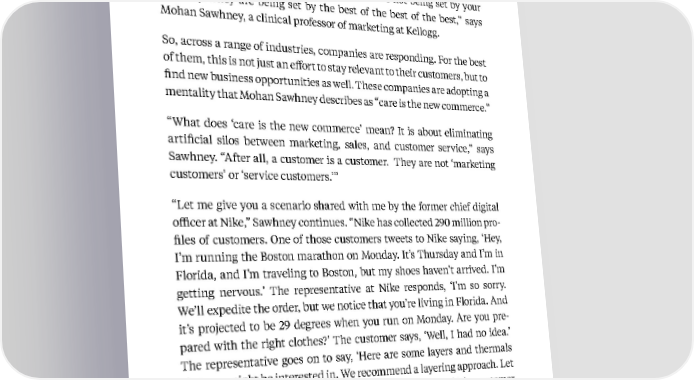 28 Kellogg Insight Now, no matter what you sell, you’re on the hook to deliver this kind of experience. “Your customer’s expectations are not being set by your industry. They are being set by the best of the best of the best,” says Mohan Sawhney, a clinical professor of marketing at Kellogg. So, across a range of industries, companies are responding. For the best of them, this is not just an effort to stay relevant to their customers, but to find new business opportunities as well. These companies are adopting a mentality that Mohan Sawhney describes as “care is the new commerce.” “What does ‘care is the new commerce’ mean? It is about eliminating artificial silos between marketing, sales, and customer service,” says Sawhney. “After all, a customer is a customer. They are not ‘marketing customers’ or ‘service customers.’” “Let me give you a scenario shared with me by the former chief digital officer at Nike,” Sawhney continues. “Nike has collected 290 million pro - files of customers. One of those customers tweets to Nike saying, ‘Hey, I’m running the Boston marathon on Monday. It’s Thursday and I’m in Florida, and I’m traveling to Boston, but my shoes haven’t arrived. I’m getting nervous.’ The representative at Nike responds, ‘I’m so sorry. We’ll expedite the order, but we notice that you’re living in Florida. And it’s projected to be 29 degrees when you run on Monday. Are you pre - pared with the right clothes?’ The customer says, ‘Well, I had no idea.’ The representative goes on to say, ‘Here are some layers and thermals that you might be interested in. We recommend a layering approach. Let me show you samples of what I think will work for you.’ The customer picks out a few, and the rep says, ‘We’ll put all this together. Tell us the hotel you’re staying at in Boston, and it will all be there for you in time for the marathon.’” Based on insights from Mohan Sawhney