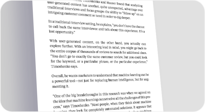 105 Kellogg Insight Unexpected Benefits In doing their research, Timoshenko and Hauser found that analyzing user-generated content has another, quite unexpected, advantage over traditional interviews and focus groups: the ability to “follow up” on an intriguing customer comment or need in order to dig deeper. In a traditional-interview setting, he explains, “you don’t have the chance to call back the same interviewee and talk about this experience. It’s a lost opportunity.” With user-generated content, on the other hand, you actually can explore further. With an interesting lead in mind, you might go back to the entire corpus of thousands of reviews to search for additional clues. “You don’t go to exactly the same customer review, but you could look for the keyword, or a particular phrase, or the particular experience,” Timoshenko says. Overall, he wants marketers to understand that machine learning can be a powerful tool—not just for replacing human intelligence, but for aug - menting it. “One of the big breakthroughs in this research was when we agreed on the idea that machine learning cannot solve all the challenges of this pro - cess,” says Timoshenko. “Most people, when they think about machine learning, they look for completely automated solutions. It appears that humans are just much better, naturally, in some tasks than machines. And they will stay better in the foreseeable future. And formulating cus- tomer needs is one of these tasks.” Based on research from Artem Timoshenko