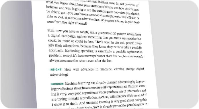 88 Kellogg Insight as a brand, incorporate this ambiguity into your decision-making? This is where your own intuition and instinct come in. But by virtue of what you know about how your customers behave and how the channel behaves and who is going to see the campaign or not—data you should be able to get—you can have a sense of what might work. You will also be able to look at outcomes after the fact. Do you see a bump in your busi - ness from the right channel? Still, now you have to weigh, say, a guaranteed 20 percent return from a digital campaign against something that you think was positive but could be more or could be less. That’s why, in the end, people diver - sify their allocations, because they know they need to take a portfolio approach. Marketing spending is essentially a portfolio-optimization problem, except it’s in some ways harder than finance, because we can’t always measure the return even after the fact. INSIGHT: How will advances in machine learning change digital advertising? GORDON: Machine learning has already changed advertising by improv - ing predictions about how someone will respond to an ad. Machine learn - ing is very, very good at problems where you have lots of information and are trying to make a prediction, such as, will someone click on an ad if I show it to them. And machine learning is very good about doing this quickly and on a large scale. So it is already part of the plumbing now in a lot of digital-advertising campaigns, whether people know it or not. INSIGHT: Are there other trends marketing leaders should keep an eye on? GORDON: Absolutely. First is the emergence of other companies in the Based on insights from Brett Gordon