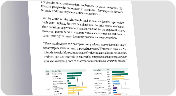 64 Kellogg Insight Take the pair of graphs below, which display shares of aggregate income by type among individuals aged 65 and over in the U.S. The graphs show the same data. But because the data are organized dif - ferently, people who encounter the graphs will likely approach them dif - ferently and thus may draw different conclusions. For the graph on the left, people tend to compare income types within each year—noting, for instance, that Social Security income was higher than earnings or government pensions in 1962. For the graph on the right, however, people tend to compare values across years for each income type—noting that most income types have increased over time. “The visual system can’t compare every value to every other value. That’s too complex even for such a powerful system,” Franconeri explains. “So it tends to prioritize comparisons of values that are close to one another, and you can use that rule to control the comparisons that you make when you are analyzing data or that your audience makes when you present.” Based on insights from Steve Franconeri Credit: Steve Franconeri. Data from the Social Security Administration . Income Type Ye a r Social Security 1962 2007 Earnings 1962 2007 Asset Income 1962 2007 Private Pensions 1962 2007 Gov’t Empl Pensions 1962 2007 Other 1962 2007 0% 10% 20% 30% Ye a r Income Type 1962 Social Security Earnings Asset Income Private Pensions Gov’t Empl Pensions Other 2007 Social Security Earnings Asset Income Private Pensions Gov’t Empl Pensions Other 0% 10% 20% 30%