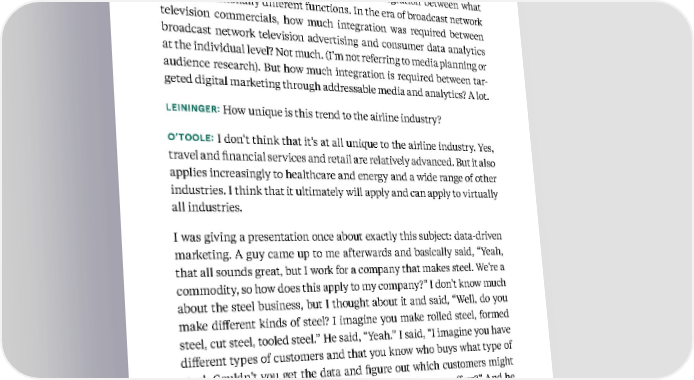 44 Kellogg Insight O’TOOLE: Restructuring the marketing function requires getting com - fortable with and proficient at much greater integration between what were conventionally different functions. In the era of broadcast network television commercials, how much integration was required between broadcast network television advertising and consumer data analytics at the individual level? Not much. (I’m not referring to media planning or audience research). But how much integration is required between tar - geted digital marketing through addressable media and analytics? A lot. LEININGER: How unique is this trend to the airline industry? O’TOOLE: I don’t think that it’s at all unique to the airline industry. Yes, travel and financial services and retail are relatively advanced. But it also applies increasingly to healthcare and energy and a wide range of other industries. I think that it ultimately will apply and can apply to virtually all industries. I was giving a presentation once about exactly this subject: data-driven marketing. A guy came up to me afterwards and basically said, “Yeah, that all sounds great, but I work for a company that makes steel. We’re a commodity, so how does this apply to my company?” I don’t know much about the steel business, but I thought about it and said, “Well, do you make different kinds of steel? I imagine you make rolled steel, formed steel, cut steel, tooled steel.” He said, “Yeah.” I said, “I imagine you have different types of customers and that you know who buys what type of steel. Couldn’t you get the data and figure out which customers might be prospects for specific types of additional products or offers?” And he said, “I suppose that we could.” I think that it’s really a matter of refram - ing the business and looking at it in terms of what data is available and how it could be used. Based on insights from Tom O ’ Too le and Eric Leininger