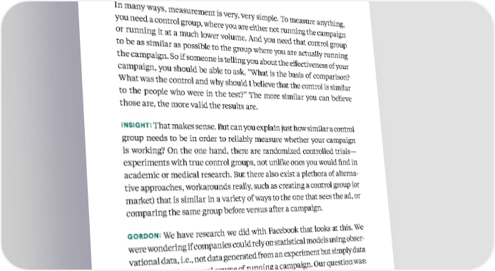 85 Kellogg Insight measurement is being done correctly or not. Someone selling you ads may have incentives that don’t align with yours. In many ways, measurement is very, very simple. To measure anything, you need a control group, where you are either not running the campaign or running it at a much lower volume. And you need that control group to be as similar as possible to the group where you are actually running the campaign. So if someone is telling you about the effectiveness of your campaign, you should be able to ask, “What is the basis of comparison? What was the control and why should I believe that the control is similar to the people who were in the test?” The more similar you can believe those are, the more valid the results are. INSIGHT: That makes sense. But can you explain just how similar a control group needs to be in order to reliably measure whether your campaign is working? On the one hand, there are randomized controlled trials— experiments with true control groups, not unlike ones you would find in academic or medical research. But there also exist a plethora of alterna - tive approaches, workarounds really, such as creating a control group (or market) that is similar in a variety of ways to the one that sees the ad, or comparing the same group before versus after a campaign. GORDON: We have research we did with Facebook that looks at this. We were wondering if companies could rely on statistical models using obser - vational data, i.e., not data generated from an experiment but simply data collected in the normal course of running a campaign. Our question was: How well do these observational methods do? And the beauty of partner - ing with Facebook was they let us directly compare randomized exper - iments with several observational approaches to assess whether they were a good substitute. And by and large, we found that unfortunately Based on insights from Brett Gordon
