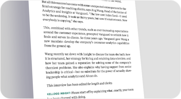 48 Kellogg Insight Over time, the popularity of index-fund investing has skyrocketed, and today Vanguard is the largest provider of mutual funds in the world. But all this success has come with some unexpected consequences for the firm’s strategy for reaching clients, says Jing Wang, Head of the Center of Analytics and Insights at Vanguard. “The low-cost index fund—it used to be the underdog. It took us thirty years, but now it’s mainstream. Now everybody is copying,” she says. This, combined with other trends, such as ever-increasing expectations around the customer experience, prompted Vanguard to rethink how it finds and serves its clients. So three years ago, Vanguard gave Wang a new mandate: develop the company’s consumer-analytics capabilities from the ground up. Wang recently sat down with Insight to discuss the team she built: how it is structured, her strategy for hiring and retaining data scientists, and how her team gained a reputation for solving some of the company’s thorniest problems. She also explains why having support from senior leadership is critical—but no substitute for the power of actually show - ing people what analytics and AI can do. This interview has been edited for length and clarity. KELLOGG INSIGHT: Please start off by explaining what, exactly, your team has been charged with doing. JING WANG: My team is called the Center of Analytics and Insights. We have three functions. One is a market-research function that I inher - ited from the previous organization. The next is our data-science and machine-learning group. And then the third is the analytic-enablement Based on insights from Jing Wang