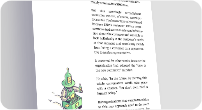 29 Kellogg Insight So what began as an interaction with a customer who called in to complain ulti - mately resulted in a $500 sale. But this seemingly serendipitous encounter was not, of course, serendipi - tous at all. The interaction only occurred because Nike’s customer service repre - sentative had access to relevant informa - tion about the customer and was able to look holistically at the customer’s needs at that moment and seamlessly switch from being a customer care representa - tive to a sales representative. It occurred, in other words, because the organization had adopted the “care is the new commerce” mindset. He adds, “In the future, by the way, this whole conversation would take place with a chatbot. You don’t even need a hu ma n being.” But organizations that want to transition to this new approach need to do much more than promote it as a mantra. For many, it will take a massive undertaking in three areas: creating a customer-data platform to get all customer data in one Based on insights from Mohan Sawhney