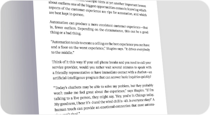 80 Kellogg Insight Use Outliers to Optimize Automation The Spanish-instruction example hints at yet another important lesson about outliers: one of the biggest opportunities comes in knowing which aspects of the customer experience are ripe for automation, and which are best kept in-person. Automation can produce a more consistent customer experience—that is, fewer outliers. Depending on the circumstance, this can be a good thing or a bad thing. “Automation tends to create a ceiling on the best experience you can have and a floor on the worst experience,” Shapiro says. “It drives everybody to the middle.” Think of it this way: If your cell phone breaks and you need to call your service provider, would you rather wait several minutes to speak with a friendly representative or have immediate contact with a chatbot—an artificial-intelligence program that can answer basic inquiries quickly? “Today’s chatbots may be able to solve my problem, but they probably won’t make me feel great about the experience,” says Shapiro. “If I’m talking to a live person, they might say, ‘Hey, you’re in Chicago today. My goodness, I hear it’s -3 and the wind chill is -40. Is everyone okay?’ A human touch can provide an emotional connection that most automa - tion can’t rival.” Outliers can be useful for helping companies determine where a given customer interaction should fall along the continuum between in-per - son and automated, says Shapiro. “Every organization needs to answer Based on insights from Joel K. Shapiro