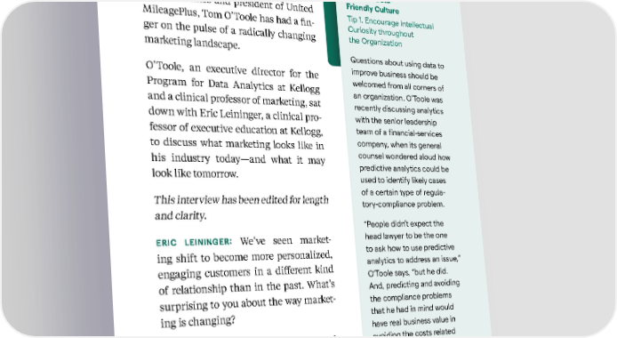 37 Kellogg Insight Create a Data- Friendly Culture Tip 1. Encourage Intellectual Curiosity throughout the Organization Questions about using data to improve business should be welcomed from all corners of an organization. O’Toole was recently discussing analytics with the senior leadership team of a financial-services company, when its general counsel wondered aloud how predictive analytics could be used to identify likely cases of a certain type of regula- tory-compliance problem. “People didn’t expect the head lawyer to be the one to ask how to use predictive analytics to address an issue,” O’Toole says, “but he did. And, predicting and avoiding the compliance problems that he had in mind would have real business value in avoiding the costs related to lawsuits, customer settle- ments, and terminations.” For more than six years as senior vice president and chief marketing officer for United Airlines and president of United MileagePlus, Tom O’Toole has had a fin - ger on the pulse of a radically changing marketing landscape. O’Toole, an executive director for the Program for Data Analytics at Kellogg and a clinical professor of marketing, sat down with Eric Leininger, a clinical pro - fessor of executive education at Kellogg, to discuss what marketing looks like in his industry today—and what it may look like tomorrow. This interview has been edited for length and clarity. ERIC LEININGER: We’ve seen market - ing shift to become more personalized, engaging customers in a different kind of relationship than in the past. What’s surprising to you about the way market - ing is changing? TOM O’TOOLE: It may not be fully appreci - ated how advanced data-driven targeted marketing has become. At United, for example, we are currently Based on insights from Tom O ’ Too le and Eric Leininger