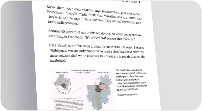 58 Kellogg Insight YOU HAVE A GREAT IDEA TO GROW your business, and it’s based on solid data. How do you convince your skeptical boss, staff, or clients of your brilliance? Show them your data visually, says Northwestern professor Steven Franconeri. “People might think that visualizations are pretty and they’re icing,” he says. “That’s not true. They are indispensable, abso - lutely indispensable.” Around 40 percent of our brains are devoted to visual comprehension, according to Franconeri. “It’s critical that you use that machine.” Data visualization has been around for more than 100 years. Florence Nightingale was an early pioneer who used a visualization to prove that more soldiers died while lingering in unsanitary hospitals than on the battlefield. But in the past decade or two, data visualization has become more sophis- ticated. The technology for displaying data has improved, and research is establishing best practices for communicating data visually. This classic data-visualization example was created by Florence Nightingale to show that more soldiers were dying from preventable diseases after battle (blue) than had died from wounds on the battlefield (red). Credit: Wikicommons Based on insights from Steve Franconeri