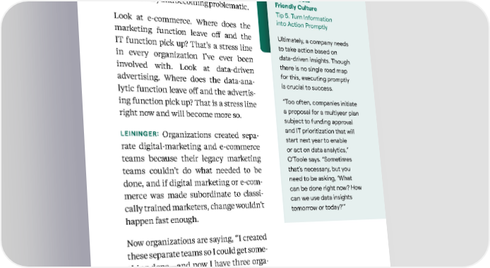 43 Kellogg Insight structure is increasingly anachronistic. The functional distinctions are now at best arbitrary and becoming problematic. Look at e-commerce. Where does the marketing function leave off and the IT function pick up? That’s a stress line in every organization I’ve ever been involved with. Look at data-driven advertising. Where does the data-ana - lytic function leave off and the advertis- ing function pick up? That is a stress line right now and will become more so. LEININGER: Organizations created sepa - rate digital-marketing and e-commerce teams because their legacy marketing teams couldn’t do what needed to be done, and if digital marketing or e-com - merce was made subordinate to classi - cally trained marketers, change wouldn’t happen fast enough. Now organizations are saying, “I created these separate teams so I could get some - thing done—and now I have three orga - nizations where really I need one unified organization.” What do you see as the biggest challenge of getting from those siloed organizations to one organization? Based on insights from Tom O ’ Too le and Eric Leininger Create a Data- Friendly Culture Tip 5. Turn Information into Action Promptly Ultimately, a company needs to take action based on data-driven insights. Though there is no single road map for this, executing promptly is crucial to success. “Too often, companies initiate a proposal for a multiyear plan subject to funding approval and IT prioritization that will start next year to enable or act on data analytics,” O’Toole says. “Sometimes that’s necessary, but you need to be asking, ‘What can be done right now? How can we use data insights tomorrow or today?’”