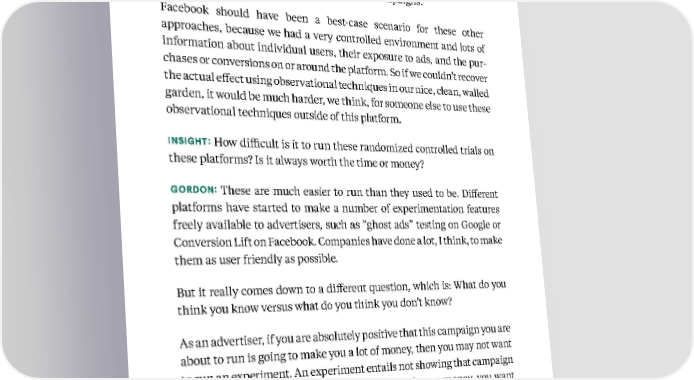 86 Kellogg Insight you couldn’t rely on the observational techniques to recover anything close to the true experimental effect of the ad campaigns. Facebook should have been a best-case scenario for these other approaches, because we had a very controlled environment and lots of information about individual users, their exposure to ads, and the pur - chases or conversions on or around the platform. So if we couldn’t recover the actual effect using observational techniques in our nice, clean, walled garden, it would be much harder, we think, for someone else to use these observational techniques outside of this platform. INSIGHT: How difficult is it to run these randomized controlled trials on these platforms? Is it always worth the time or money? GORDON: These are much easier to run than they used to be. Different platforms have started to make a number of experimentation features freely available to advertisers, such as “ghost ads” testing on Google or Conversion Lift on Facebook. Companies have done a lot, I think, to make them as user friendly as possible. But it really comes down to a different question, which is: What do you think you know versus what do you think you don’t know? As an advertiser, if you are absolutely positive that this campaign you are about to run is going to make you a lot of money, then you may not want to run an experiment. An experiment entails not showing that campaign to some people. If you are sure it is going to make you money, you want to show it to everyone possible: you don’t want that control group to not see your campaign. On the other hand, if you’re uncertain, or you want to know how effective Based on insights from Brett Gordon