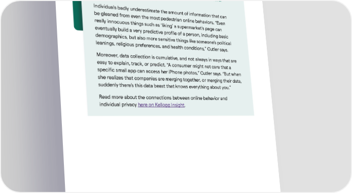 97 Kellogg Insight Social-media data can be a boon to marketers and researchers. What happens to individuals? Individuals badly underestimate the amount of information that can be gleaned from even the most pedestrian online behaviors. “Even really innocuous things such as ‘liking’ a supermarket’s page can eventually build a very predictive profile of a person, including basic demographics, but also more sensitive things like someone’s political leanings, religious preferences, and health conditions,” Cutler says. Moreover, data collection is cumulative, and not always in ways that are easy to explain, track, or predict. “A consumer might not care that a specific small app can access her iPhone photos,” Cutler says. “But when she realizes that companies are merging together, or merging their data, suddenly there’s this data beast that knows everything about you.” Read more about the connections between online behavior and individual privacy here on Kellogg Insight . Featured Faculty Jennifer Cutler , Associate Professor of Marketing at Kellogg Based on research from Jennifer Cutler