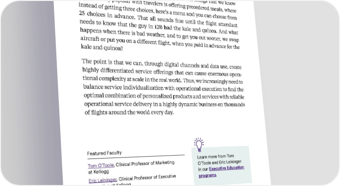 46 Kellogg Insight I’ll tell you a different and growing question that we think about: oper - ational complexity. Here’s an example. One of the things that we know is potentially popular with travelers is offering preordered meals, where instead of getting three choices, here’s a menu and you can choose from 25 choices in advance. That all sounds fine until the flight attendant needs to know that the guy in 12B had the kale and quinoa. And what happens when there is bad weather, and to get you out sooner, we swap aircraft or put you on a different flight, when you paid in advance for the kale and quinoa? The point is that we can, through digital channels and data use, create highly differentiated service offerings that can cause enormous opera - tional complexity at scale in the real world. Thus, we increasingly need to balance service individualization with operational execution to find the optimal combination of personalized products and services with reliable operational service delivery in a highly dynamic business on thousands of flights around the world every day. Featured Faculty Tom O’Toole , Clinical Professor of Marketing at Kellogg Eric Leininger , Clinical Professor of Executive Education at Kellogg Related Resources Read: 5 Ways to Attract and Retain Data Scientists Read: How Marketing Leaders Can Thrive Amidst “Tectonic” Shifts in Expectations Learn more from Tom O’Toole and Eric Leininger in our Executive Education programs . Based on insights from Tom O ’ Too le and Eric Leininger