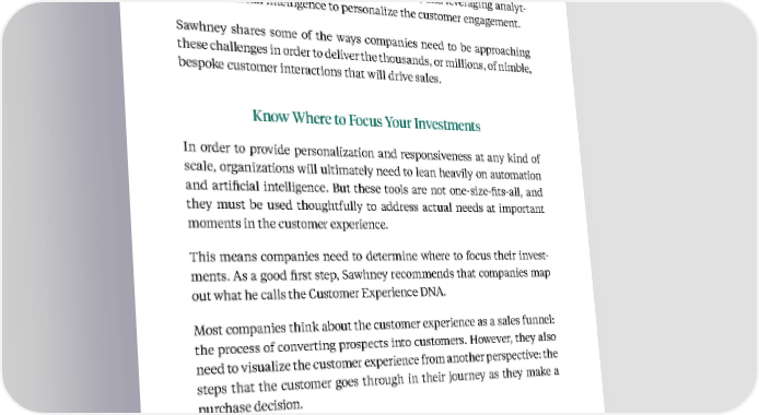 30 Kellogg Insight place; building a unified system of engagement that allows customers to interact across all digital and physical channels; and leveraging analyt - ics and artificial intelligence to personalize the customer engagement. Sawhney shares some of the ways companies need to be approaching these challenges in order to deliver the thousands, or millions, of nimble, bespoke customer interactions that will drive sales. Know Where to Focus Your Investments In order to provide personalization and responsiveness at any kind of scale, organizations will ultimately need to lean heavily on automation and artificial intelligence. But these tools are not one-size-fits-all, and they must be used thoughtfully to address actual needs at important moments in the customer experience. This means companies need to determine where to focus their invest - ments. As a good first step, Sawhney recommends that companies map out what he calls the Customer Experience DNA. Most companies think about the customer experience as a sales funnel: the process of converting prospects into customers. However, they also need to visualize the customer experience from another perspective: the steps that the customer goes through in their journey as they make a purchase decision. To Sawhney, these two processes—the customer journey and the cus- tomer-funnel-management journey—can be visualized as two interwo - ven strands. He proposes the metaphor of the DNA, with its double-helix structure, as the basis of a framework called the Customer Experience Based on insights from Mohan Sawhney
