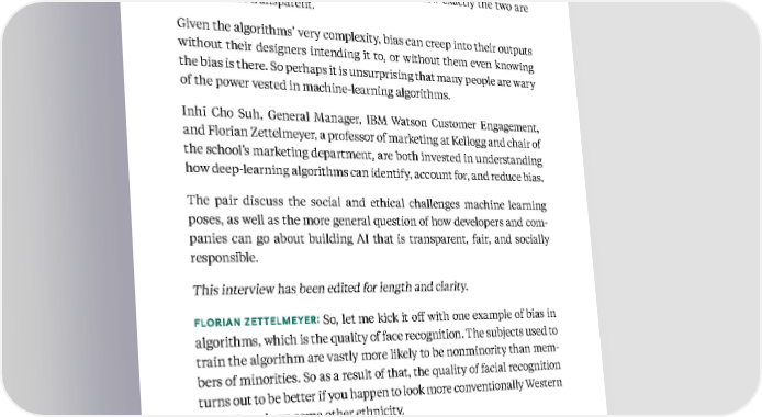 117 Kellogg Insight can be extraordinarily powerful, but they are also “black boxes,” where the inputs and the outputs may be visible, but how exactly the two are related is not transparent. Given the algorithms’ very complexity, bias can creep into their outputs without their designers intending it to, or without them even knowing the bias is there. So perhaps it is unsurprising that many people are wary of the power vested in machine-learning algorithms. Inhi Cho Suh, General Manager, IBM Watson Customer Engagement, and Florian Zettelmeyer, a professor of marketing at Kellogg and chair of the school’s marketing department, are both invested in understanding how deep-learning algorithms can identify, account for, and reduce bias. The pair discuss the social and ethical challenges machine learning poses, as well as the more general question of how developers and com - panies can go about building AI that is transparent, fair, and socially responsible. This interview has been edited for length and clarity. FLORIAN ZETTELMEYER: So, let me kick it off with one example of bias in algorithms, which is the quality of face recognition. The subjects used to train the algorithm are vastly more likely to be nonminority than mem - bers of minorities. So as a result of that, the quality of facial recognition turns out to be better if you happen to look more conventionally Western than if you have some other ethnicity. INHI CHO SUH: Yes, that’s one example of a bias because of a lack of data. Another really good example of this bias is in loan approval. If you look at the financial-services sector, there are fewer women-owned businesses. Based on insights from Florian Zettelmeyer and Inhi Cho Suh