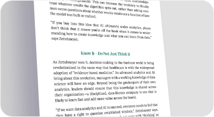 15 Kellogg Insight enough to detect complicated statistical relationships among variables, but because they are “black boxes,” the nature of those relationships isn’t easy to conceptualize. This can increase the tendency to blindly trust whatever results the algorithm spits out, rather than asking com - mon-sense questions about whether wonky results are a function of how the model was built or trained. “If you buy into this idea that AI ultimately scales analytics, please don’t think that it means you’re off the hook when it comes to under - standing how to create knowledge and what you can learn from data,” says Zettelmeyer. Know It—Do Not Just Think It As Zettelmeyer sees it, decision-making in the business world is being revolutionized in the same way that healthcare is with the widespread adoption of “evidence-based medicine.” As advanced analytics and AI bring about this revolution, managers with a working knowledge of data science will have an edge. Beyond being the gatekeepers of their own analytics, leaders should ensure that this knowledge is shared across their organization—a disciplined, data-literate company is one that is likely to learn fast and add more value across the board. “If we want data analytics and AI to succeed, everyone needs to feel that they have a right to question established wisdom,” Zettelmeyer says. “There has to be a culture where you can’t get away with ‘thinking’ as opposed to ‘knowing.’” Developing such a culture is a big challenge for leaders. Organizations are rarely willing to admit the need for change, and few managers feel Based on insights from Florian Zettelmeyer