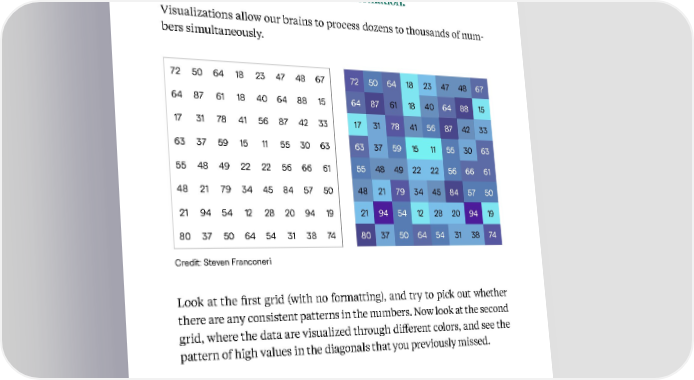 61 Kellogg Insight 2. Visualizations can make it easier to make sense of information. Visualizations allow our brains to process dozens to thousands of num - bers simultaneously. Look at the first grid (with no formatting), and try to pick out whether there are any consistent patterns in the numbers. Now look at the second grid, where the data are visualized through different colors, and see the pattern of high values in the diagonals that you previously missed. Credit: Steven Franconeri Based on insights from Steve Franconeri 72 50 64 18 23 47 48 67 64 87 61 18 40 64 88 15 17 31 78 41 56 87 42 33 63 37 59 15 11 55 30 63 55 48 49 22 22 56 66 61 48 21 79 34 45 84 57 50 21 94 54 12 28 20 94 19 80 37 50 64 54 31 38 74 72 50 64 18 23 47 48 67 64 87 61 18 40 64 88 15 17 31 78 41 56 87 42 33 63 37 59 15 11 55 30 63 55 48 49 22 22 56 66 61 48 21 79 34 45 84 57 50 21 94 54 12 28 20 94 19 80 37 50 64 54 31 38 74