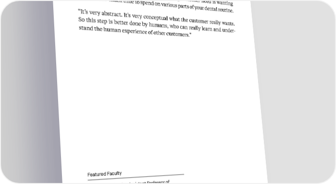 106 Kellogg Insight A customer might say, “I don’t like this toothbrush because it doesn’t have a 30-second timer.” But the underlying customer need is wanting to know how much time to spend on various parts of your dental routine. “It’s very abstract. It’s very conceptual what the customer really wants. So this step is better done by humans, who can really learn and under - stand the human experience of other customers.” Featured Faculty Artem Timoshenko , Assistant Professor of Marketing at Kellogg Related Resources Read: People Are Tweeting about Your Products. Will It Boost Sales? Based on research from Artem Timoshenko