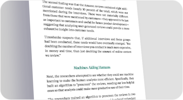 103 Kellogg Insight and focus groups,” says Timoshenko. “And that is the most time-con - suming part of market research for customer needs.” The second finding was that the Amazon reviews contained eight addi - tional customer needs (nearly 10 percent of the total), which were not mentioned during the interviews. These were not materially different from those that were mentioned by customers—they appeared to be just as important to customers and useful for future product development— suggesting that analyzing user-generated reviews could provide a more exhaustive insight into customer needs. Timoshenko suspects that, if additional interviews and focus groups had been conducted, these needs would have eventually emerged. “But doubling the number of interviews you conduct is much more expensive, in money and time, than just doubling the amount of online content we review.” Machines Aiding Humans Next, the researchers attempted to see whether they could use machine learning to make the human analysts more efficient. Specifically, they built an algorithm to “prescreen” the reviews, weeding out less helpful ones so that analysts could make more productive use of their time. The researchers trained an algorithm to prescreen the reviews in two ways: it removed non-informative sentences, and it reduced redundant ones. Non-informative sentences, which make up nearly half of all of the sentences in the corpus, might simply say, “My son loves this pro - duct”—a perfectly legitimate sentiment, but not one that will lead to Based on research from Artem Timoshenko