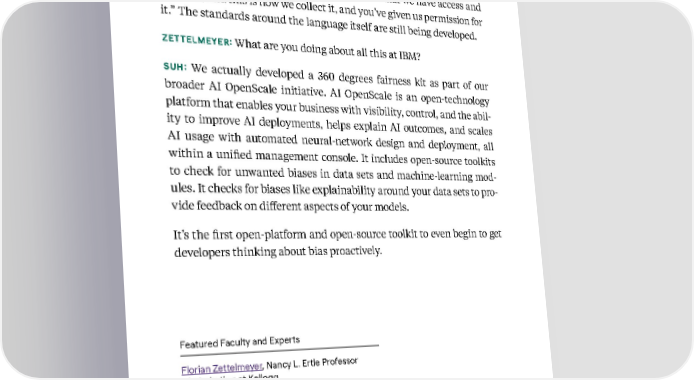 123 Kellogg Insight SUH: No. And there’s not a common language for talking about it either, in terms of explicitly saying, “We only use data that we have access and rights to, and this is how we collect it, and you’ve given us permission for it.” The standards around the language itself are still being developed. ZETTELMEYER: What are you doing about all this at IBM? SUH: We actually developed a 360 degrees fairness kit as part of our broader AI OpenScale initiative. AI OpenScale is an open-technology platform that enables your business with visibility, control, and the abil - ity to improve AI deployments, helps explain AI outcomes, and scales AI usage with automated neural-network design and deployment, all within a unified management console. It includes open-source toolkits to check for unwanted biases in data sets and machine-learning mod - ules. It checks for biases like explainability around your data sets to pro - vide feedback on different aspects of your models. It’s the first open-platform and open-source toolkit to even begin to get developers thinking about bias proactively. Featured Faculty and Experts Florian Zettelmeyer , Nancy L. Ertle Professor of Marketing at Kellogg Inhi Cho Suh, General Manager, IBM Watson Customer Engagement Related Resources Read: Watson Is Just the Beginning Based on insights from Florian Zettelmeyer and Inhi Cho Suh