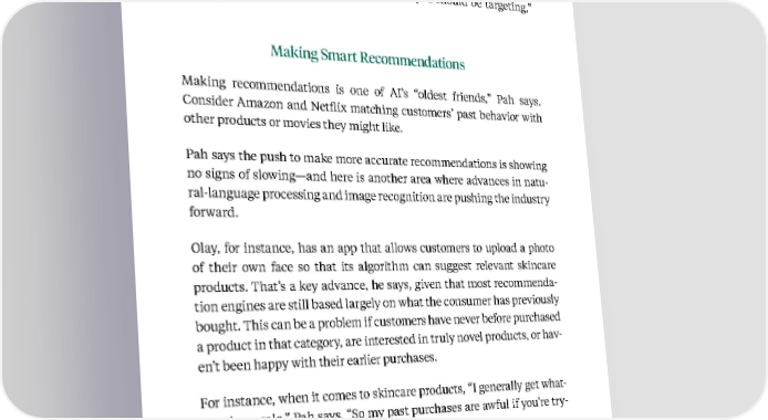 111 Kellogg Insight what people write and track Instagram as a way to understand when and where you are showing up, as well as whom you should be targeting,” says Pah. Making Smart Recommendations Making recommendations is one of AI’s “oldest friends,” Pah says. Consider Amazon and Netflix matching customers’ past behavior with other products or movies they might like. Pah says the push to make more accurate recommendations is showing no signs of slowing—and here is another area where advances in natu - ral-language processing and image recognition are pushing the industry forward. Olay, for instance, has an app that allows customers to upload a photo of their own face so that its algorithm can suggest relevant skincare products. That’s a key advance, he says, given that most recommenda - tion engines are still based largely on what the consumer has previously bought. This can be a problem if customers have never before purchased a product in that category, are interested in truly novel products, or hav - en’t been happy with their earlier purchases. For instance, when it comes to skincare products, “I generally get what - ever is on sale,” Pah says. “So my past purchases are awful if you’re try - ing to help me actually take care of my skin.” Pah points out that the art of using image recognition to generate rec - ommendations is still being perfected: Olay’s app still requires users to Based on insights from Adam Pah