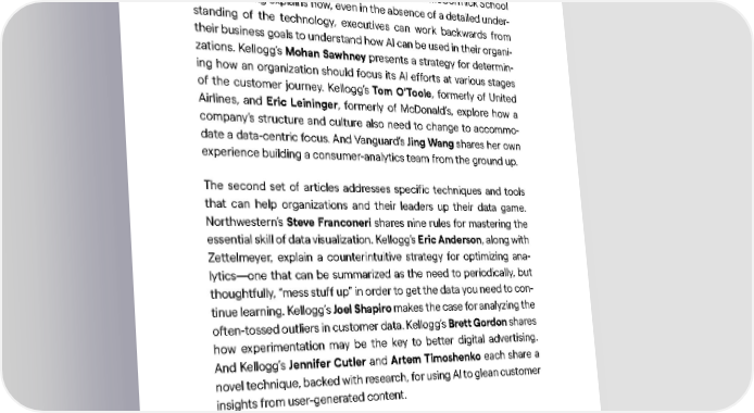 04 Kellogg Insight From the Editor makes the case for why leaders must develop a working knowledge of data science. Kris Hammond from Northwestern’s McCormick School of Engineering explains how, even in the absence of a detailed under - standing of the technology, executives can work backwards from their business goals to understand how AI can be used in their organi- zations. Kellogg’s Mohan Sawhney presents a strategy for determin- ing how an organization should focus its AI efforts at various stages of the customer journey. Kellogg’s Tom O’Toole , formerly of United Airlines, and Eric Leininger , formerly of McDonald’s, explore how a company’s structure and culture also need to change to accommo- date a data-centric focus. And Vanguard’s Jing Wang shares her own experience building a consumer-analytics team from the ground up. The second set of articles addresses specific techniques and tools that can help organizations and their leaders up their data game. Northwestern’s Steve Franconeri shares nine rules for mastering the essential skill of data visualization. Kellogg’s Eric Anderson , along with Zettelmeyer, explain a counterintuitive strategy for optimizing ana- lytics—one that can be summarized as the need to periodically, but thoughtfully, “mess stuff up” in order to get the data you need to con- tinue learning. Kellogg’s Joel Shapiro makes the case for analyzing the often-tossed outliers in customer data. Kellogg’s Brett Gordon shares how experimentation may be the key to better digital advertising. And Kellogg’s Jennifer Cutler and Artem Timoshenko each share a novel technique, backed with research, for using AI to glean customer insights from user-generated content. Finally, two articles—featuring Adam Pah of Kellogg and Inhi Cho Suh of IBM—explore how AI is already transforming the field of mar - keting and examine the questions that organizations are asking, and