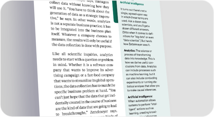 10 Kellogg Insight Analytics vs. Artificial Intelligence Start with the Problem Too often, Zettelmeyer says, managers collect data without knowing how they will use it. “You have to think about the generation of data as a strategic impera - tive,” he says. In other words, analytics is not a separate business practice; it has to be integrated into the business plan itself. Whatever a company chooses to measure, the results will only be useful if the data collection is done with purpose. Like all scientific inquiries, analytics needs to start with a question or problem in mind. Whether it is a software com - pany that wants to improve its adver - tising campaign or a fast-food company that wants to streamline its global opera - tions, the data collection has to match the specific business problem at hand. “You can’t just hope that the data that get inci - dentally created in the course of business are the kind of data that are going to lead to breakthroughs,” Zettelmeyer says. “While it is obvious that some kinds of data should be collected, customer inter - actions have to be designed with analyt - ics in mind to ensure that you have the measures you need.” Based on insights from Florian Zettelmeyer It turns out there’s not a single, agreed-upon way in which these terms are used. Ask a dozen data scientists, and you’ll get a dozen different answers. (Ditto when it comes to defi- nitions for “big data” or even “data scientist.”) But here’s how Zettelmeyer sees it. Analytics: The science or process of transforming data into knowledge. This is how we derive useful con- clusions from data. Analytics can include processes such as machine learning, but it can also include conducting experiments or running sta- tistical analyses that allow you to make causal inferences. Artificial Intelligence: When automation allows systems to perform “intel- ligent” actions such as learning, creating knowl- edge, making inferences and decisions, and solving problems. In Zettelmeyer’s view, AI is so exciting because it scales analytics.