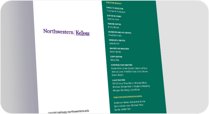 KELLOGG SCHOOL OF MANAGEMENT DEAN Francesca Cornelli KELLOGG INSIGHT FACULTY DIRECTOR Thomas N. Hubbard EDITOR IN CHIEF Jessica Love SENIOR EDITOR Emily Stone BUSINESS AND ART EDITOR Fred Schmalz RESEARCH EDITOR Jake Smith MARKETING MANAGER Kevin Bailey COPY EDITOR Maja Kos CONTRIBUTING WRITERS Susie Allen, Drew Calvert, Glenn Jeffers, Jessica Love, Fred Schmalz, Emily Stone, Dylan Walsh I LLU S TR ATO RS Will Dinsky, Riley Mann, Michael Meier, Michael Morgenstern, Yevgenia Nayberg, Morgan Ramberg, Lisa Röper KELLOGG EXECUTIVE EDUCATION Gretchen Baker, Genevieve Burke, Sammi Esterman, Michael Peck, Daniel Underriter KELLOGG COMMUNICATIONS Shannon Camperson, Meredith Klein KELLOGG CREATIVE DIGITAL SERVICES Kay Meyer, Sofia Park, Marnie Vosper CONTACT KELLOGG INSIGHT [email protected] SUBSCRIBE TO OUR EMAIL NEWSLETTER kell.gg/subscribe_2020 insight.kellogg.northwestern.edu