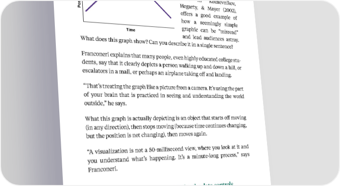 63 Kellogg Insight This image, based on one used in Kozhevnikov, Hegarty, & Mayer (2002), offers a good example of how a seemingly simple graphic can be “misread” and lead audiences astray. What does this graph show? Can you describe it in a single sentence? Franconeri explains that many people, even highly educated college stu - dents, say that it clearly depicts a person walking up and down a hill, or escalators in a mall, or perhaps an airplane taking off and landing. “That’s treating the graph like a picture from a camera. It’s using the part of your brain that is practiced in seeing and understanding the world outside,” he says. What this graph is actually depicting is an object that starts off moving (in any direction), then stops moving (because time continues changing, but the position is not changing), then moves again. “A visualization is not a 50-millisecond view, where you look at it and you understand what’s happening. It’s a minute-long process,” says Franconeri. 5. The way that you organize the data controls the pattern that the eye will see. If visualizations need to be read, what controls how you will order each of the “sentences”? Based on insights from Steve Franconeri Time Position Based on a finding fr om Ko zhe vniko v, Hegarty & Ma yer (2002)