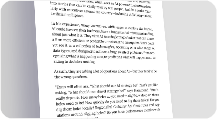 18 Kellogg Insight Hammond is a professor of computer science at Northwestern’s McCormick School of Engineering. He is also cofounder and scientific advisor for Narrative Science, which uses an AI-powered tool to turn data into stories that can be easily read by real people. And he speaks regu - larly with executives around the country—including at Kellogg—about artificial intelligence. In his experience, many executives, while eager to explore the impact AI could have on their business, have a fundamental misunderstanding about just what it is. They view AI as a single magic bullet that can make a firm more efficient or profitable or resistant to disruption. They don’t yet see it as a collection of technologies, operating on a wide range of data types, and designed to address a huge swath of problems, from rec - ognizing what is happening now, to predicting what will happen next, to aiding in decision-making. As such, they are asking a lot of questions about AI—but they tend to be the wrong questions. “Execs will often ask, ‘What should our AI strategy be?’ That’s just like asking, ‘What should our shovel strategy be?’” says Hammond. “But it really depends. How many holes do you need to dig? How deep do those holes need to be? How quickly do you need to dig those holes? Do you dig those holes locally? Regionally? Globally? Are there rules and reg - ulations around digging holes? Do you have performance metrics with regards to digging holes?” Instead of seeking out a single perfect tool to harness, or even a single right path toward technological success, Hammond argues, these lead - ers need to do what they do best: think carefully about the business Based on insights from Kris Hammond