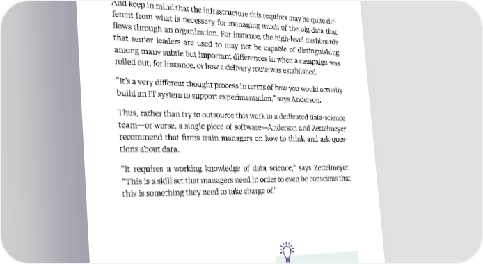 75 Kellogg Insight how could you design an experiment to demonstrate that link, given your existing capabilities and constraints? And keep in mind that the infrastructure this requires may be quite dif - ferent from what is necessary for managing much of the big data that flows through an organization. For instance, the high-level dashboards that senior leaders are used to may not be capable of distinguishing among many subtle but important differences in when a campaign was rolled out, for instance, or how a delivery route was established. “It’s a very different thought process in terms of how you would actually build an IT system to support experimentation,” says Anderson. Thus, rather than try to outsource this work to a dedicated data-science team—or worse, a single piece of software—Anderson and Zettelmeyer recommend that firms train managers on how to think and ask ques- tions about data. “It requires a working knowledge of data science,” says Zettelmeyer. “This is a skill set that managers need in order to even be conscious that this is something they need to take charge of.” Featured Faculty Eric T. Anderson , Professor of Marketing at Kellogg Florian Zettelmeyer , Nancy L. Ertle Professor of Marketing at Kellogg Learn more from Eric Anderson and Florian Zettelmeyer in our Executive Education programs . Based on insights from Eric T. Anderson and Florian Zettelmeyer