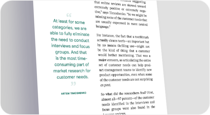 102 Kellogg Insight have a major disadvantage. Specifically, “there is a lot of research suggesting that online reviews are skewed toward extremely positive or extremely nega - tive,” says Timoshenko. “So we might be missing some of the customer needs that are usually expressed in more neutral language.” For instance, the fact that a toothbrush actually cleans teeth—an important but by no means thrilling use—might not be the kind of thing that a customer would bother mentioning. That was a major concern, as articulating the entire set of customer needs can help prod - uct-management teams to identify new product opportunities, even when some of the customer needs are not surprising ex post . So what did the researchers find? First, almost all—97 percent—of the customer needs identified in the interviews and focus groups were also found in the Amazon reviews. “That immediately suggests that, at least for some categories, we are able to fully eliminate the need to conduct interviews At least for some categories, we are able to fully eliminate the need to conduct interviews and focus groups. And that is the most time- consuming part of market research for customer needs. ARTEM TIMOSHENKO Based on research from Artem Timoshenko